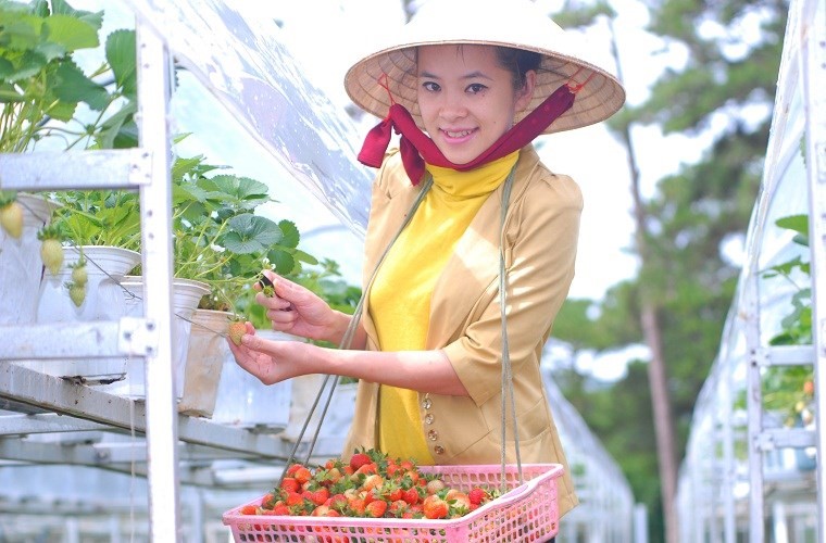 Trồng dâu tây Pháp giữa lòng Đà Lạt trong nhà kính với hệ thống tưới nhỏ giọt